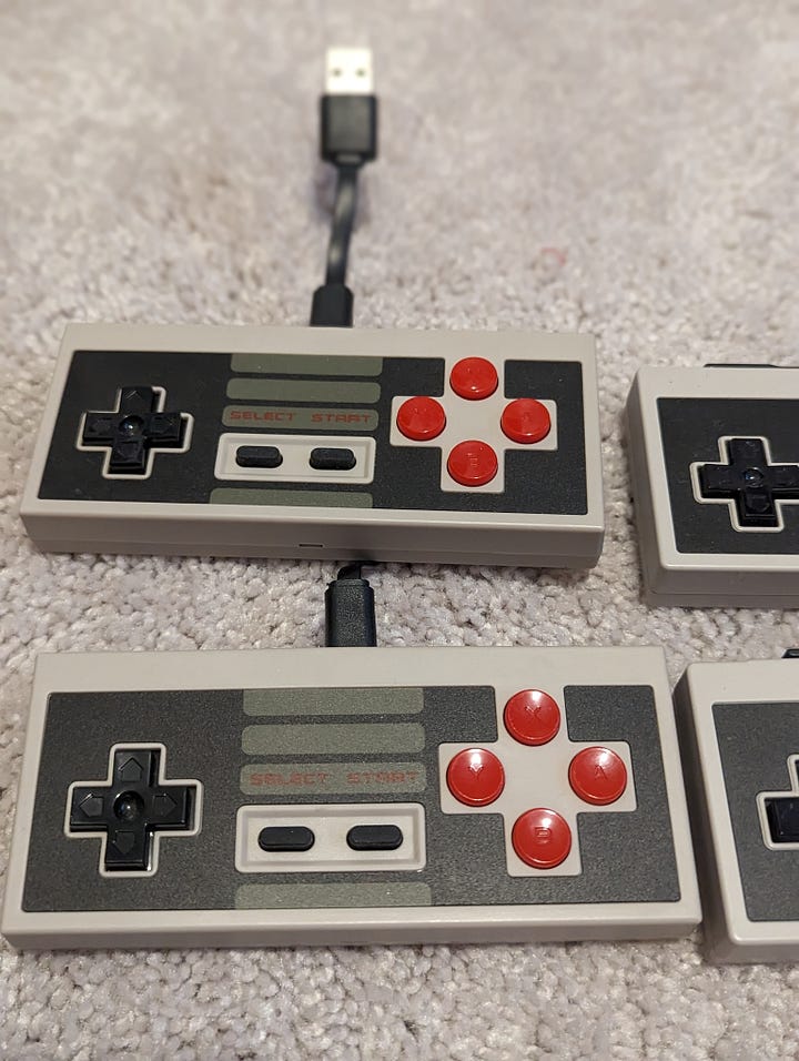 While incredibly uncomfortable, the NES controller is iconic. There’s very little guesswork too. It had two buttons. TWO! There was no “wait how do I aim and strafe and jump and run and etc etc etc” back then. You either tried A and if that didn’t work, you tried B. Simple. I have 4 other NES-style controllers. 2 from 8Bitdo and 2 from…somewhere else ( This is a trend I’m noticing). The 8Bitdo ones are fun. When Nintendo made the super cool (sarcasm) decision to have the Mini NES controller ship with a 4 inch cord, 8Bitdo stepped up, thankfully, and designed an NES controller that works wirelessly with a dongle.