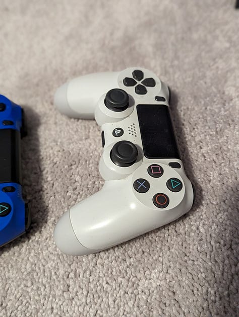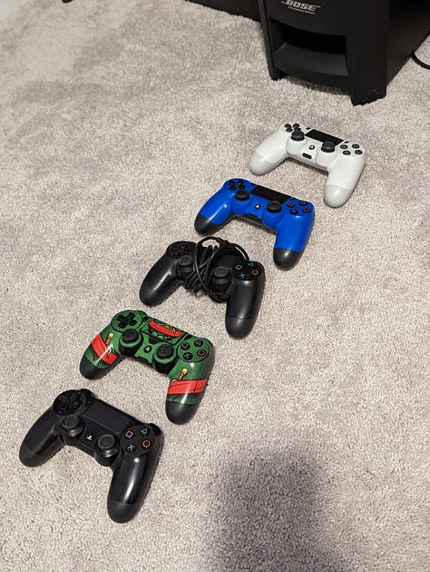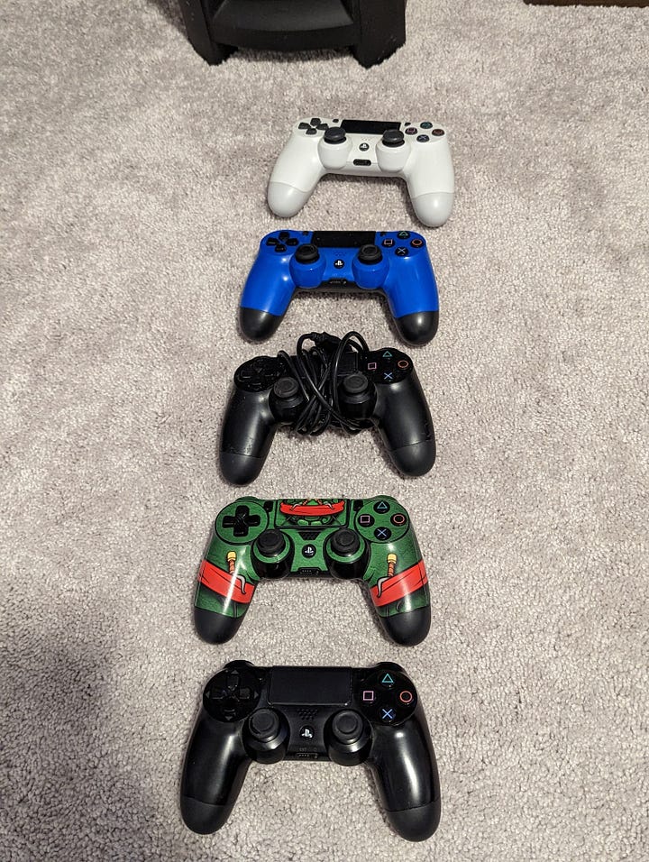 Why do I have 5 of these? Great question by you and my accountant. I sincerely have no idea. One came with the PS4, so that makes sense. But then I also got a PS4 Pro eventually, so there’s one more (the white one), and I bought a blue one because it was cool looking and then I had another black one just because and then I got a sick TMNT Decal for the PS4 Pro and put that controller decal on my other black one from the original PS4. I still don’t really know why I have 5 though.